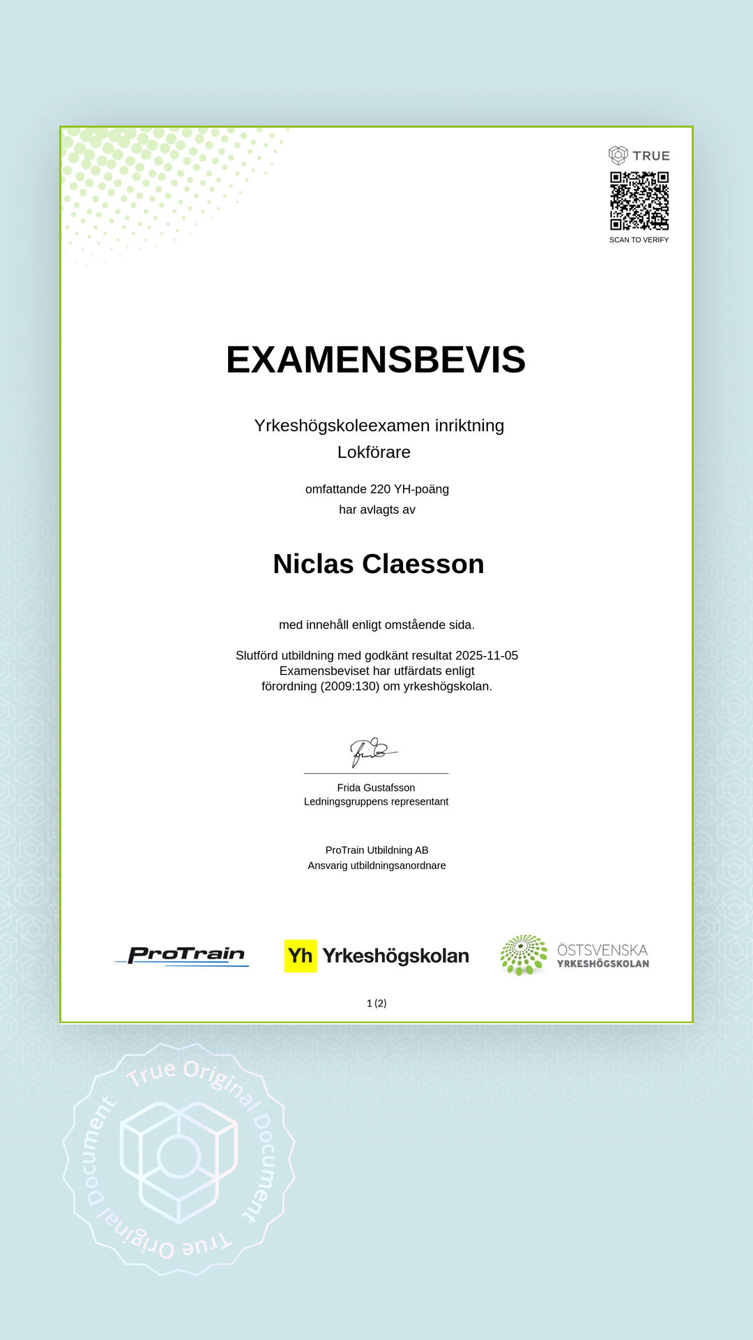Alla TRUE -document är säkrade med blockchain-teknologi och kan verifieras som äkta. Klicka på verifieringsknappen bredvid dokumentet eller skanna QR-koden med din smartphones kamera. Ingen app krävs - dokumentets äkthet verifieras omedelbart.